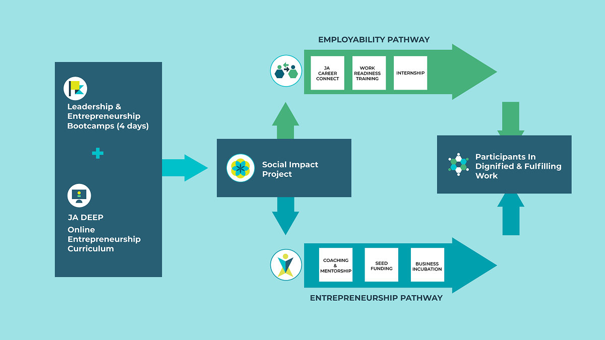 The JA Social Equity Program is a cross-cutting entrepreneurship, financial literacy, and work-readiness program for underserved young people aged 16-25 who might not be in education, entrepreneurship, or training.